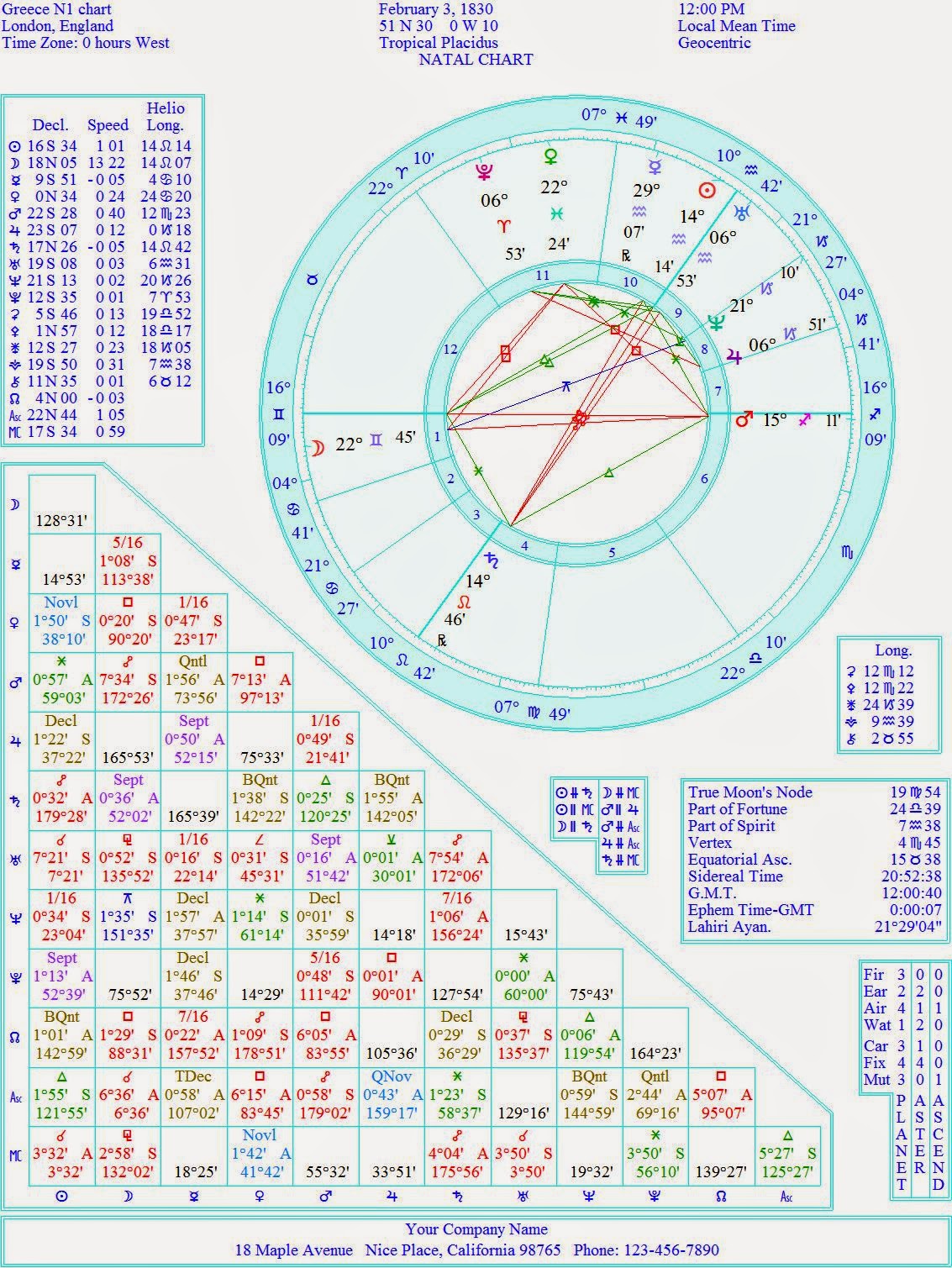 Το Ελληνικό κράτος ιδρύθηκε σύμφωνα με την συνθήκη του Λονδίνου στις 3 Φεβρουαρίου 1830 και ώρα 12:00 το μεσημέρι. Από εκείνη την στιγμή οι μεγάλες δυνάμεις αναγνώρισαν την ανεξαρτησία και την αυτοτέλεια του κράτους μας. Η χώρα μας ανήκει στο ζώδιο του Υδροχόου, έχει ωροσκόπο στους Διδύμους και Σελήνη στο ίδιο ζώδιο, στους Διδύμους. Το τρίπτυχο της προσωπικότητας του Ελληνικού κράτους χαρακτηρίζεται επικοινωνιακό, ευέλικτο, διπλωματικό. Έχουμε να κάνουμε με ένα κράτος και ειδικότερα με έναν λαό που απευθύνονται στο μέλλον, αγαπούν την πρόοδο, την καινοτομία, τις εφευρέσεις. Ως λαός είμαστε αρκετά επικοινωνιακός, επινοητικός, εφευρετικός, αγαπάμε την επιστήμη και την τεχνολογία. Το Ελληνικό κράτος μαχόταν για τα ανθρώπινα ιδανικά και ιδεώδη ήδη από τα πρώτα στάδια της ενσάρκωσής του. Εμείς, ως λαός έχουμε μία εικόνα άκρως επικοινωνιακή, είμαστε διπλωμάτες αν και ελαφρά τι καρδία. Μας διακατέχει ένα αίσθημα επιπολαιότητας αλλά και νεανικότητας.